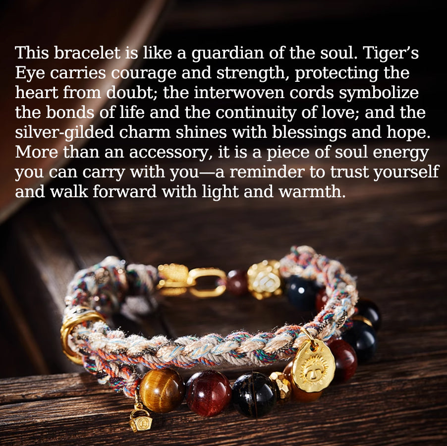 • Braided Rope: Handwoven for strength and unity, symbolizing resilience and connection, holding the bracelet together and representing strength in effort and life.